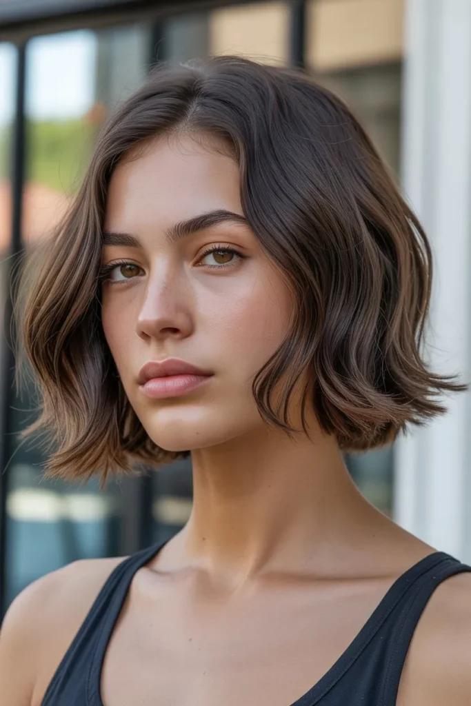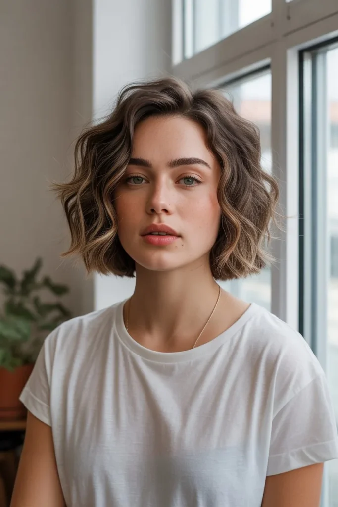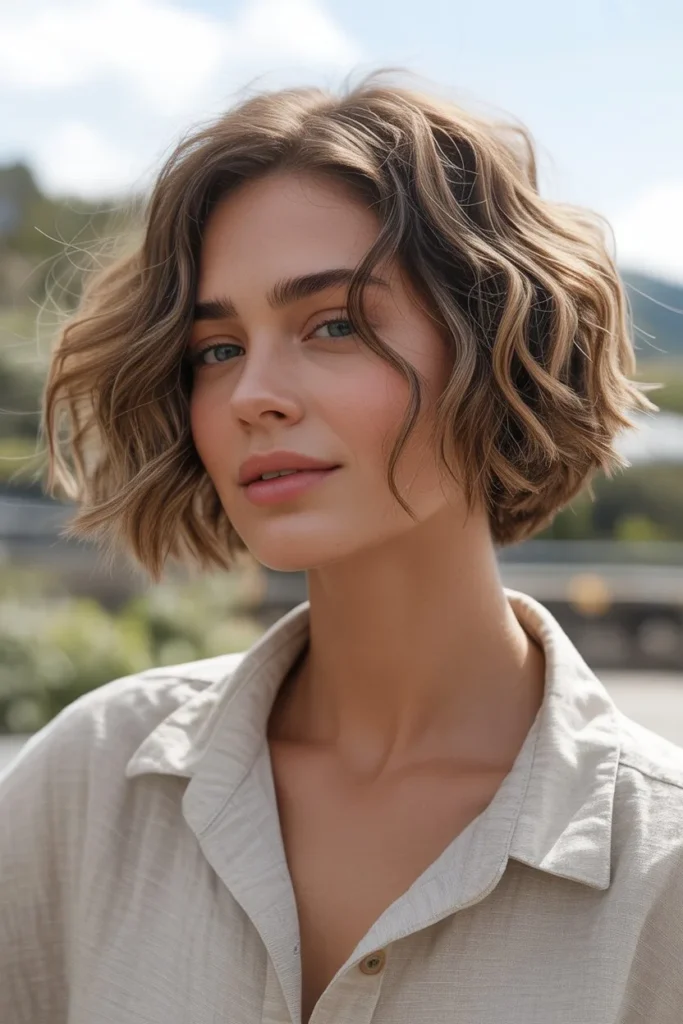 The styling of this bob emphasizes volume at the roots and throughout the lengths, creating a full, healthy appearance that’s incredibly flattering. The hair is styled with loose, irregular waves that aren’t uniform or perfect—the slight imperfection is exactly what gives this look its casual, approachable appeal. The warm brown tones with natural-looking highlights add depth and dimension, preventing the style from appearing flat despite its matte, textured finish. This cut is particularly well-suited for women with naturally wavy or textured hair who want to embrace their hair’s natural tendencies while maintaining a polished, intentional appearance.