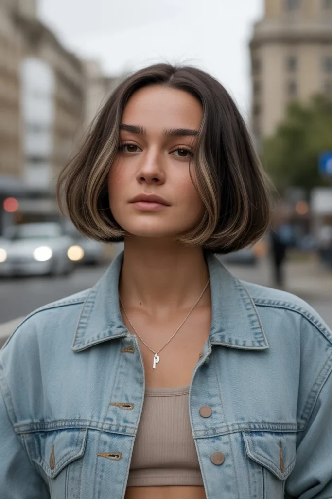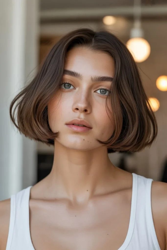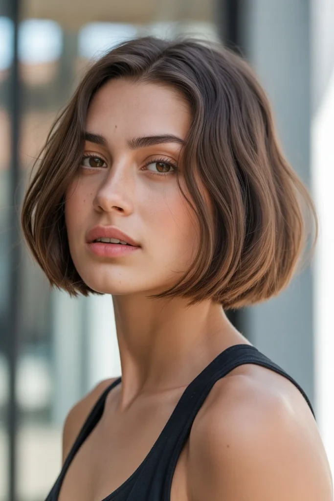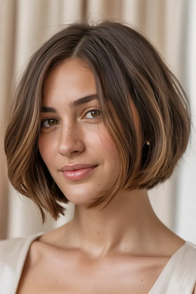 What makes this particular bob so appealing in 2026 is the emphasis on natural texture rather than overly styled perfection. The soft, face-framing layers create dimension without appearing too structured or severe. The warm brown tones with subtle highlights add depth and luminosity, while the gentle side part allows the hair to fall naturally across the face, creating a soft, approachable aesthetic. This cut is particularly flattering for oval and heart-shaped faces, as it balances facial proportions while drawing attention to the eyes and cheekbones.
