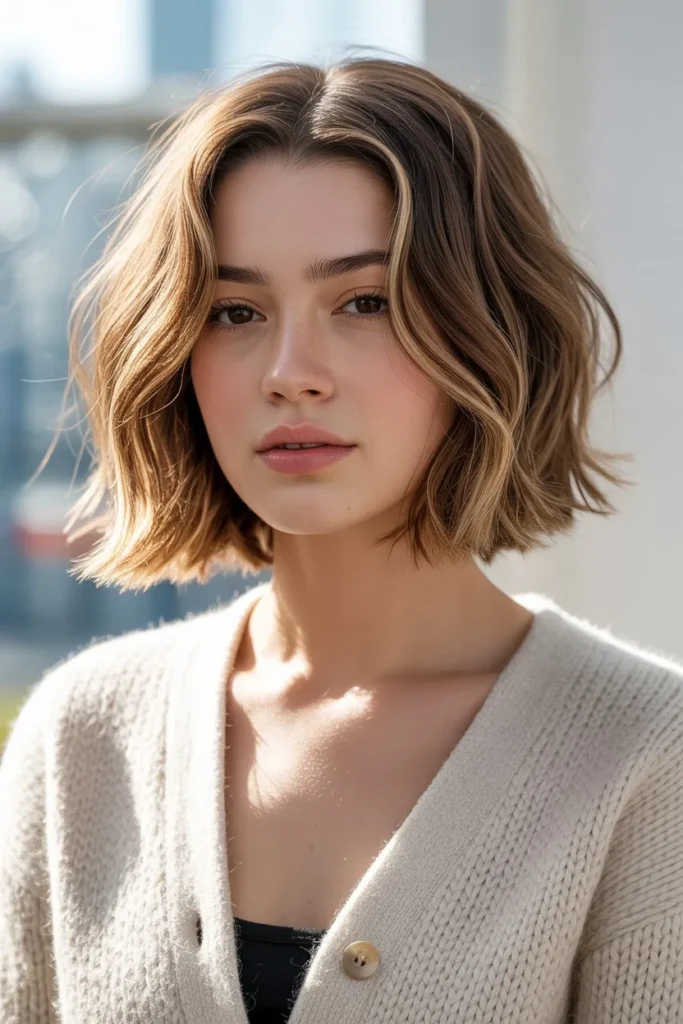 The color work in this bob adds significant visual interest through multidimensional highlighting that creates depth and luminosity. The base is a warm, medium brown enhanced with lighter caramel and honey-toned pieces that catch the light beautifully and create the illusion of additional texture and volume. The waves are loose and irregular, creating an organic appearance that suggests the hair naturally falls this way. This style is particularly well-suited for women with naturally wavy or slightly curly hair, as it works with rather than against your hair’s natural texture, resulting in a low-maintenance style that always looks polished and intentional.
