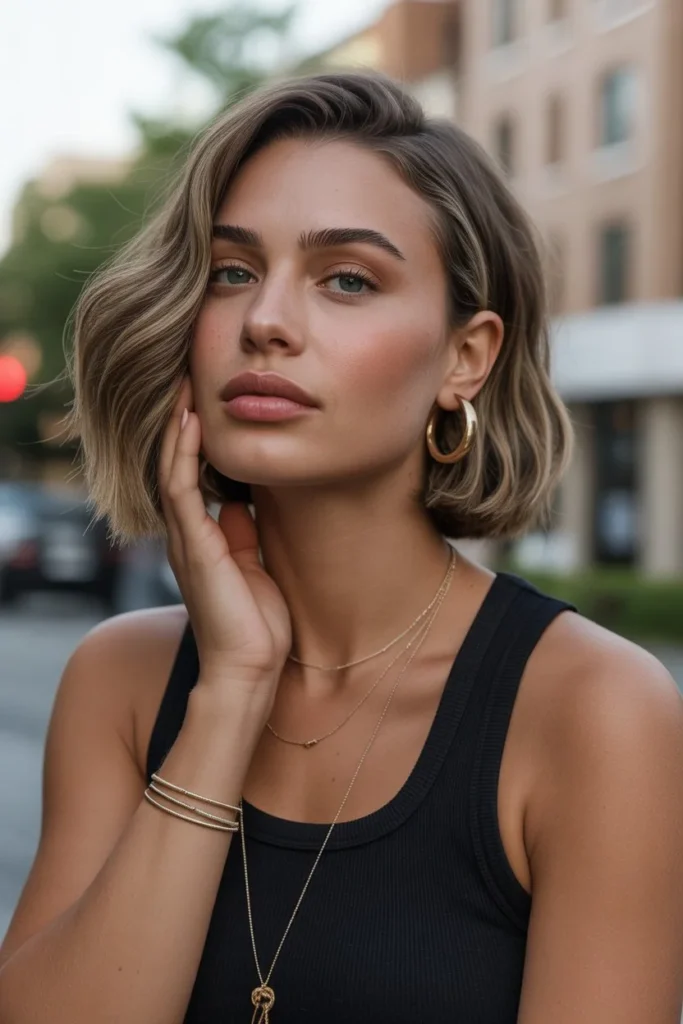 The wavy bob with golden highlights represents the perfect summer-inspired style that works beautifully year-round. This shoulder-grazing bob features soft, romantic waves that create beautiful movement and dimension, making it an ideal choice for women who want their hair to look dynamic and alive from every angle. The cut includes subtle layering that prevents the ends from appearing too heavy while maintaining fullness throughout, creating a balanced silhouette that flatters most face shapes. The waves are loose and flowing rather than tight or structured, giving the style a relaxed, approachable quality.