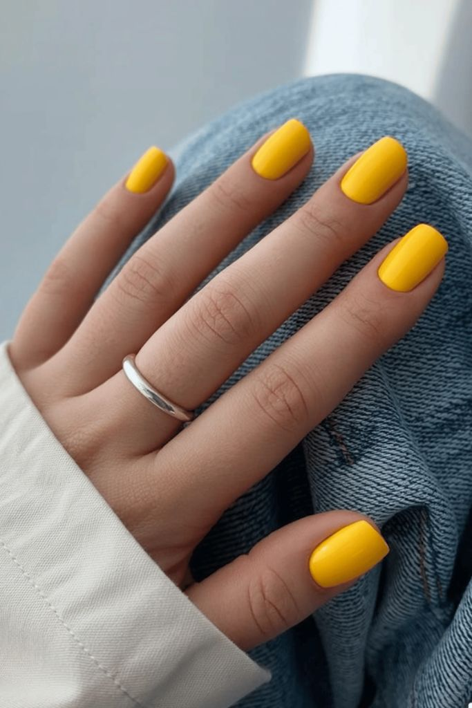 The key to making yellow work is opacity. You want a formula that’s creamy and full-coverage in two coats, not streaky. I love DND Gel Polish in their golden yellow shade for exactly this reason — the pigmentation is dense, and it self-levels beautifully. Pair it with a glossy top coat and resist the urge to go matte. This color needs shine to really sing. Keep your nails on the shorter side so the look stays chic rather than costume-y.