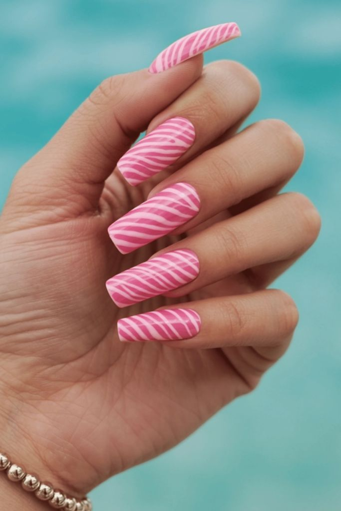 If you’ve been searching for colorful summer nail designs that make a statement, look no further. This pink and white zebra print on long coffin nails is playful, fashion-forward, and completely summer-coded. The pattern has an organic, hand-painted quality — the stripes aren’t perfectly uniform, which gives them personality and movement. Against a poolside backdrop, these nails look like wearable art. The soft pink base keeps it feminine while the zebra pattern adds an edge that’s hard to ignore.