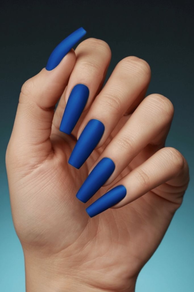 For this matte cobalt look, you’ll want a deeply pigmented blue gel polish — something like Beetles Gel Polish in their classic royal blue. Apply two thin, even coats and cure properly, then finish with a matte top coat to kill the shine. The matte finish is what elevates this from standard blue to something truly editorial. Be sure to push back your cuticles before application; clean nail beds make coffin shapes look even more striking.
