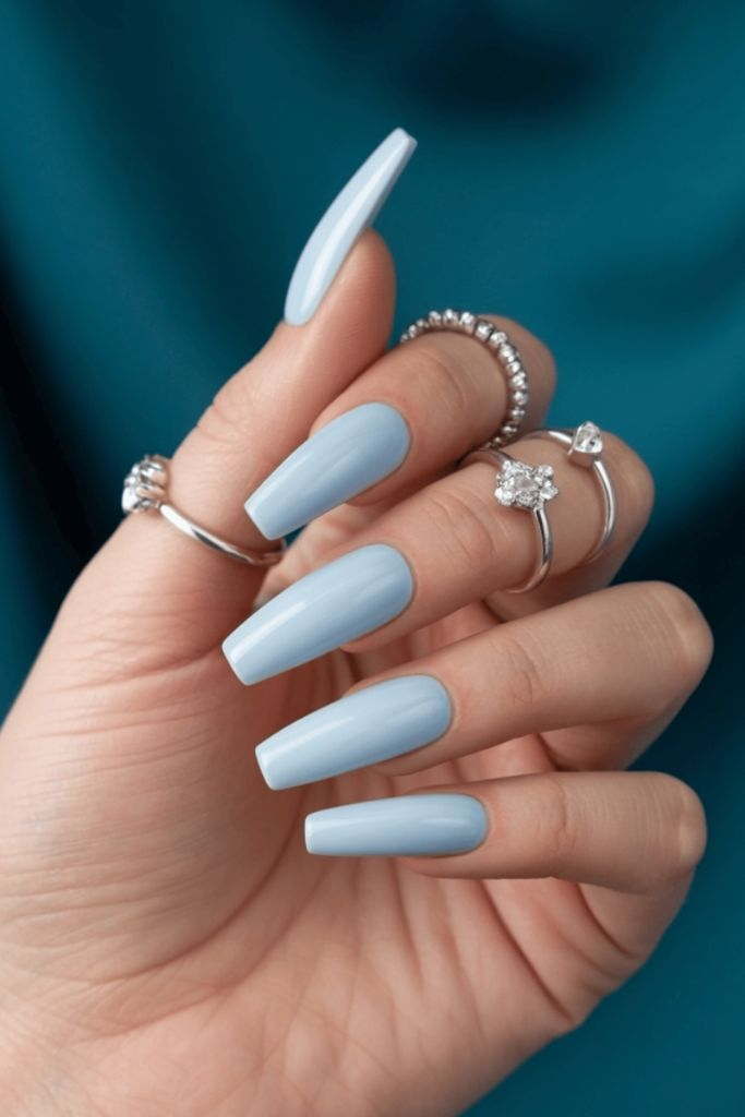 Pastel summer nails don’t have to be predictable, and this baby blue proves it beautifully. There’s a softness here that feels like a cloud on your fingertips — a pale, milky blue with a high-gloss finish that catches light from every angle. On long coffin-shaped nails adorned with delicate silver rings, this shade looks expensive, feminine, and effortlessly cool. It’s the color of a clear summer sky reflected in still water, and it pairs flawlessly with white linen, denim, or gold jewelry.