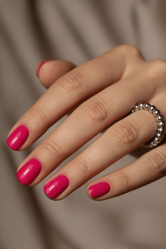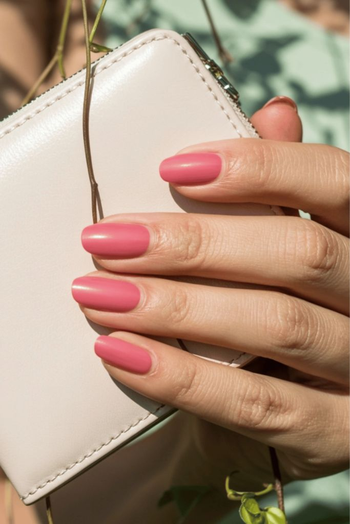 Fuchsia polishes can vary wildly in quality, so formula matters. Essie’s Big Spender is a gorgeous, creamy fuchsia that applies like butter. Two coats give you full, rich coverage without any streaking. For gel lovers, Kiara Sky’s Razzle Dazzle Berry offers similar vibrancy with weeks-long wear. Keep nails short and filed into a gentle squoval or round shape. The color is bold enough — the shape should be low-key.