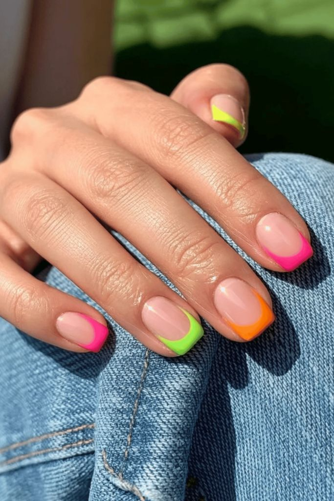 This is summer distilled into a manicure. Each nail features a different neon tip — hot pink, lime green, electric orange, neon yellow — against a natural, barely-there base. The result is joyful, almost childlike in the best possible way. It reminds me of popsicles and pool parties and that specific kind of happiness that only exists between June and August. As colorful summer nail designs go, this one captures the spirit of the season better than almost anything else on this list.