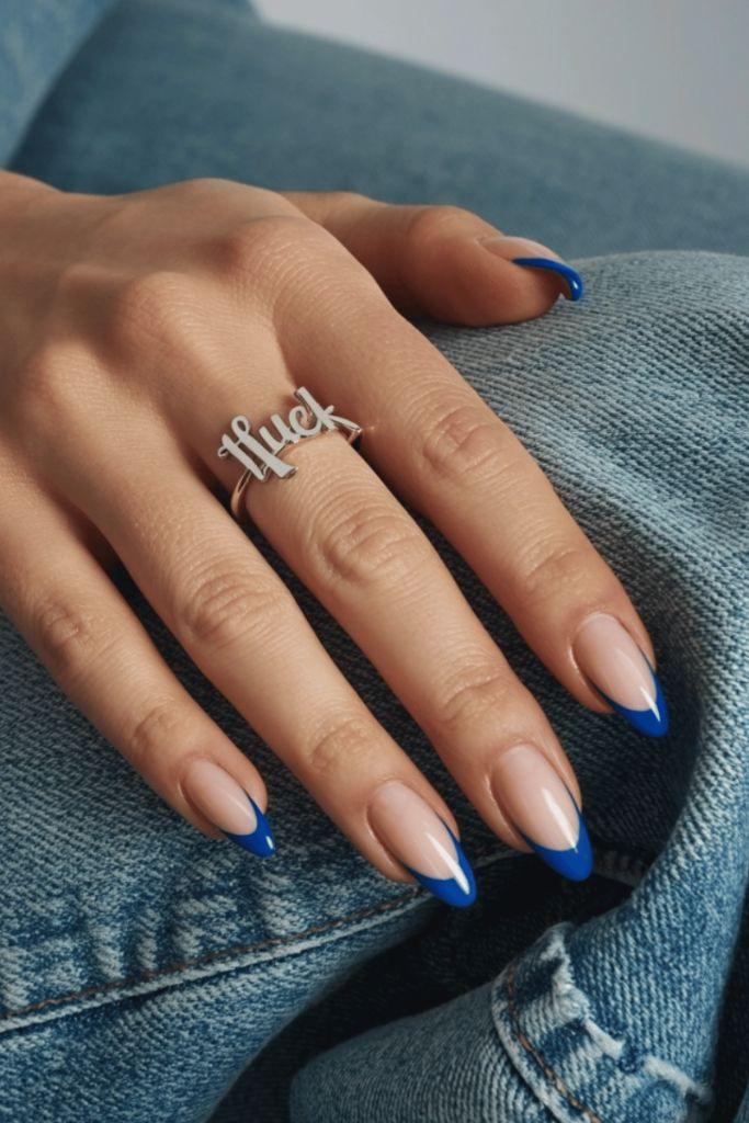 The French manicure reinvention continues, and this electric blue version on almond-shaped nails is one of the most striking iterations I’ve seen. The nude base is barely there — transparent and clean — while the tips are painted in a rich, saturated cobalt that draws the eye immediately. The almond shape adds a feminine elegance that softens the boldness of the blue. It’s sophisticated, editorial, and unmistakably modern. If you’re looking for summer nail colors 2026 that feel fresh but still classic, this is the one.