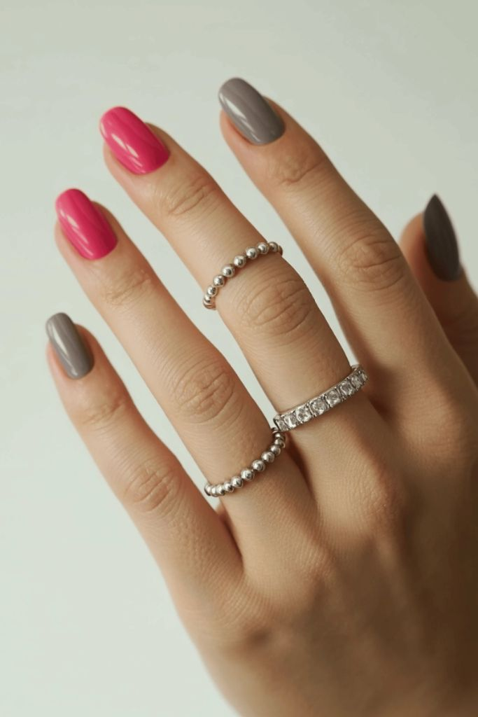 The gray acts as a perfect neutral anchor for that explosive pink. Try Zoya’s Dove for the gray tones and OPI’s Pink Flamenco for the hot pink accent. Apply two coats of each and finish with a glossy top coat for uniformity. The key is making sure both colors have the same level of shine — the cohesion comes from the finish, not the shade itself. Short, rounded nails keep this look sophisticated and modern.