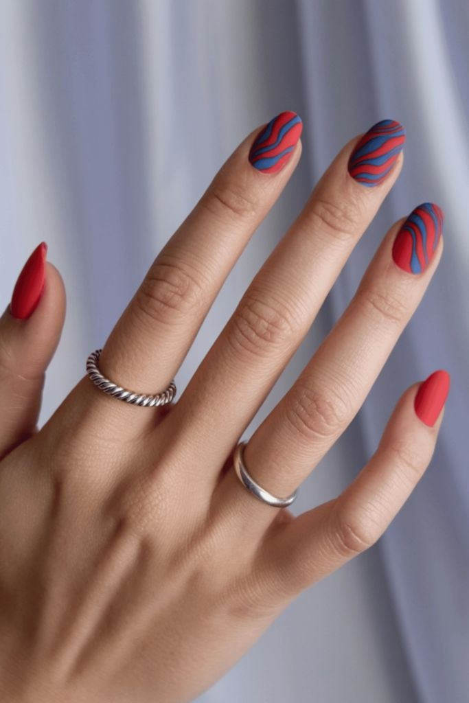 Nail art doesn’t have to be intricate to be impactful, and this red-and-blue wave design demonstrates that beautifully. Alternating between solid matte red nails and wavy red-blue abstract patterns, this manicure has an almost painterly quality — like tiny canvases on each fingertip. The matte finish elevates the entire design, giving it a contemporary art gallery feel rather than a carnival look. These vibrant summer nail trends are exactly what the season calls for.
