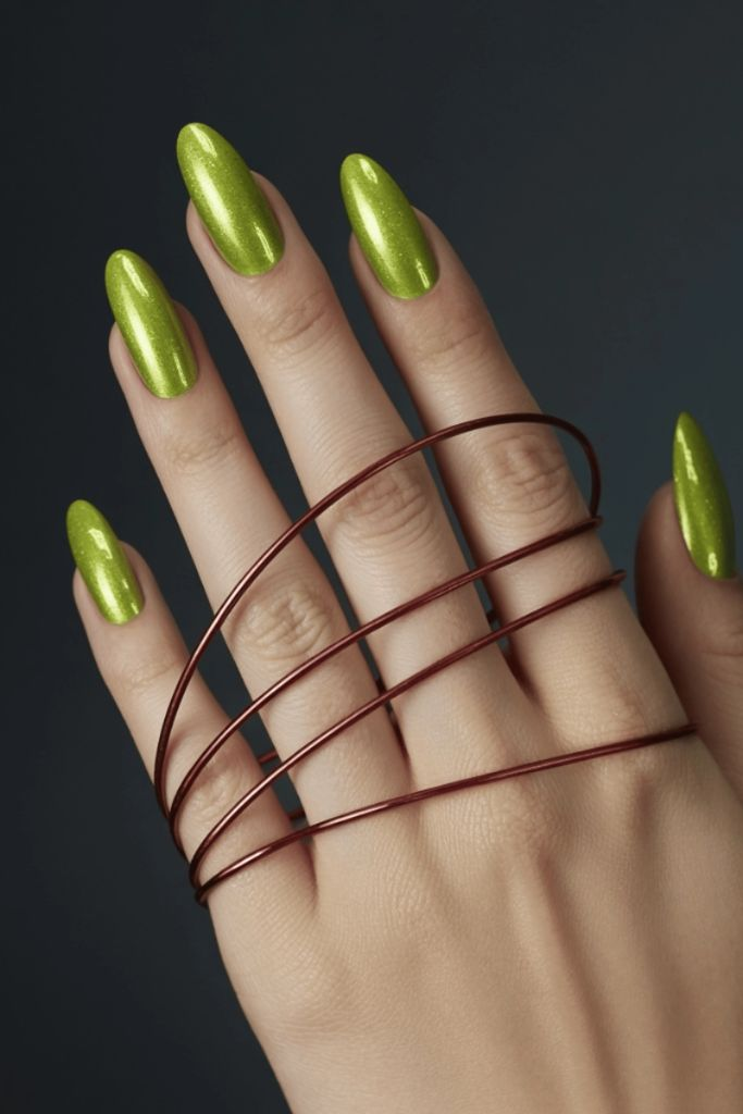 A chrome or metallic finish is crucial for this look. ILNP’s Ultra Chrome polishes offer stunning green-gold shifts that come close to this effect. Apply over a dark olive base for maximum depth, and skip the matte top coat — you want every bit of that metallic reflection. Almond-shaped nails are ideal because the tapered point draws the eye along the length of the nail, amplifying the color’s movement. Two coats of color plus a glossy top will give you that liquid-metal finish.