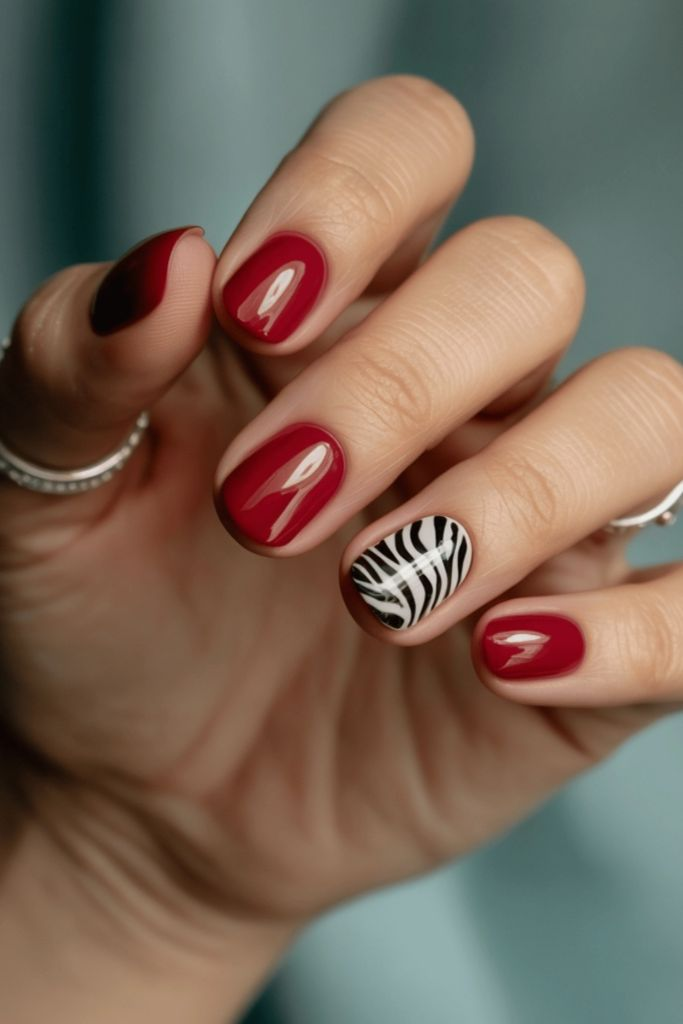 The red here should be deep and warm — think OPI’s Malaga Wine or Essie’s Bordeaux. For the accent nail, paint it white first, let it dry, then use a thin striper brush dipped in black to create zebra stripes. The stripes should be organic and slightly varied in width. Finish everything with a high-shine top coat to unify the different elements under one cohesive, glossy finish.