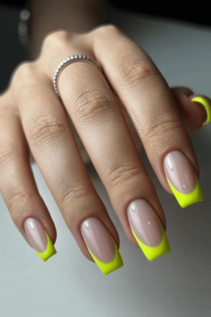 If the neon coral French tip started the revolution, the neon yellow French tip is its wilder sibling. This look takes a clean, square-shaped nude nail and finishes it with electric chartreuse-yellow tips that practically vibrate with energy. It’s one of the most eye-catching bright summer manicure ideas on this list, and it photographs like an absolute dream. Against neutral clothing and warm skin, these tips look like they’re generating their own light source.