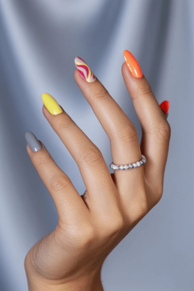 Skittle nails — where each finger wears a different color — have been around for a while, but this particular combination feels fresh and editorial for 2026. A mix of dove gray, sunny yellow, abstract pink-and-orange swirl, bright tangerine, and cherry red on almond-shaped nails creates a palette that’s retro-inspired yet thoroughly modern. Each nail feels like a standalone art piece that also happens to work beautifully as a set. This is colorful summer nail designs taken to their most creative extreme.