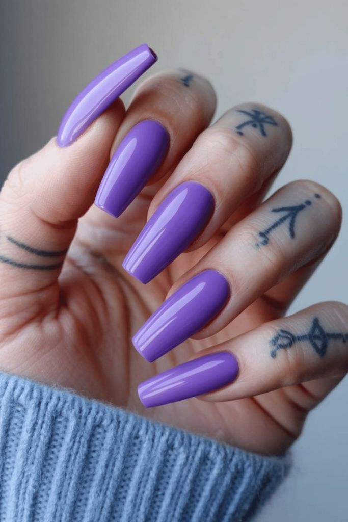 Lavender has been creeping up the trend charts for seasons now, and this summer it’s arriving in full force. A medium-toned purple with just enough warmth to avoid looking icy, this glossy lavender on long coffin nails is dreamy, whimsical, and entirely wearable. It captures the essence of pastel summer nails while packing more visual punch than a traditional pale shade. The coffin shape adds drama and length, making this a statement manicure that still feels feminine and soft.