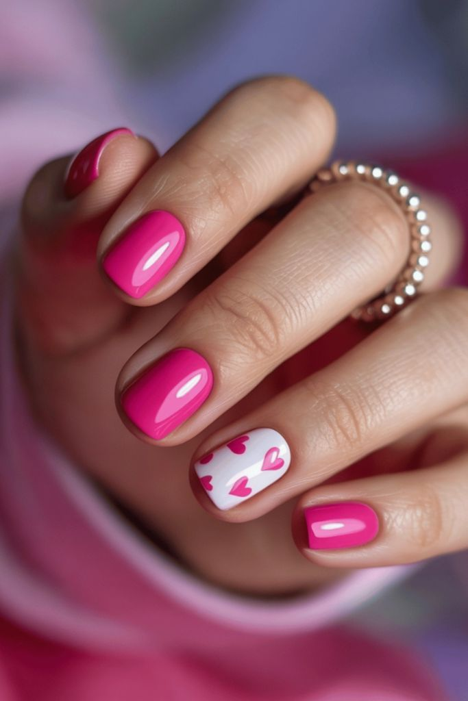 The base shade here is a true hot pink — Zoya’s Nana or DND’s Hot Pink are excellent matches. For the heart accent, start with a clean white base and use a very fine dotting tool or toothpick to create small hearts. The hearts don’t need to be perfect; the hand-drawn quality is part of the charm. A glossy gel nail color top coat over everything will unify the look and protect the art. Short, square-round nails are the ideal canvas for this design.