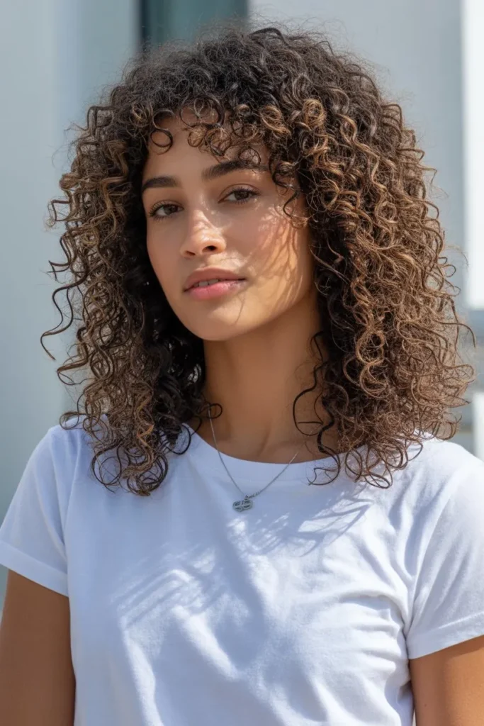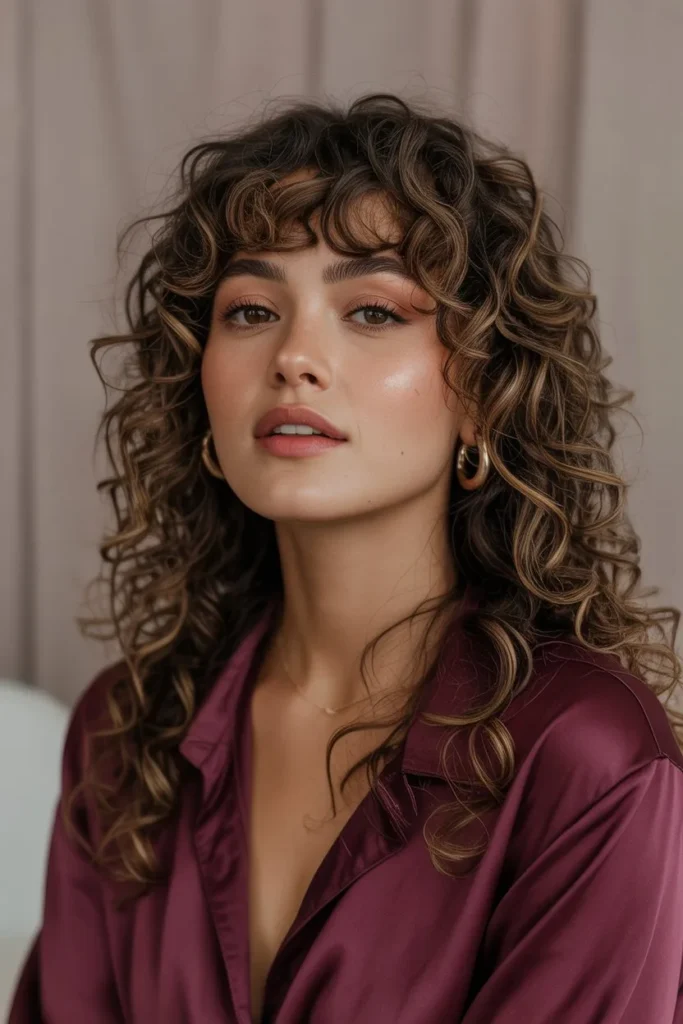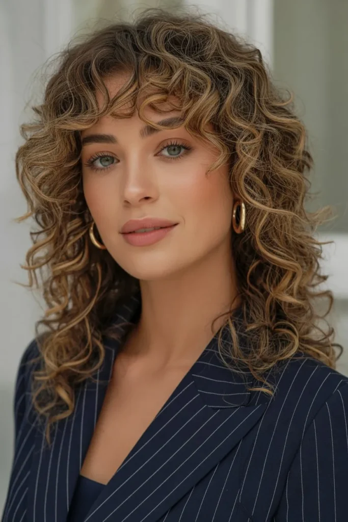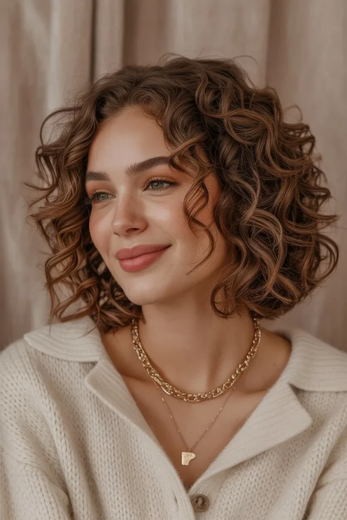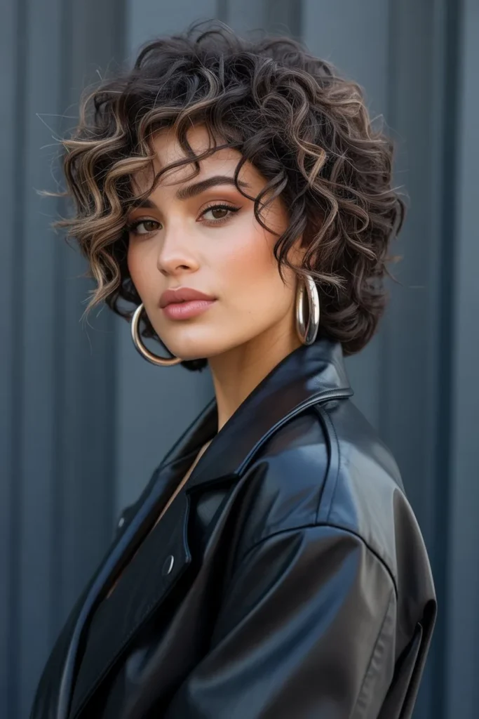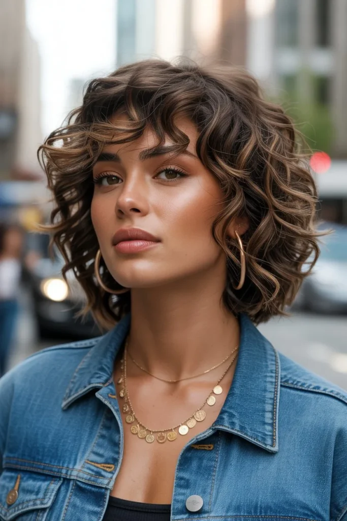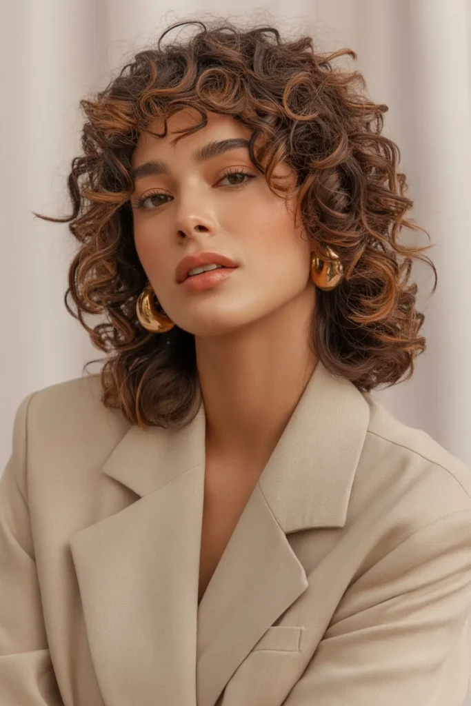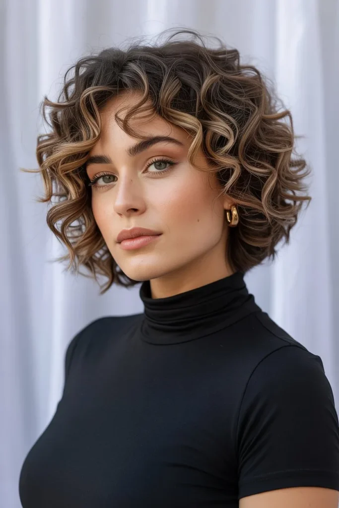 Short, sassy, and full of attitude, this curly bob with dimensional highlights is redefining what short curly hair can be in 2026. Cut to chin-length with strategic layers, this style creates beautiful volume and shape without the triangle effect that shorter curly cuts can sometimes produce. The warm caramel and honey highlights woven through the darker base add movement and dimension that prevents the style from appearing too heavy.