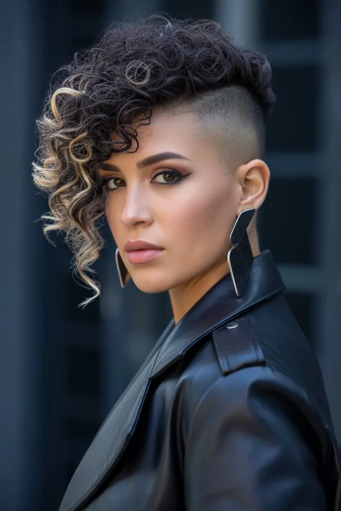 Pushing the boundaries of conventional curly hairstyles, this mohawk-inspired look features shaved sides with voluminous curls cascading from the crown. It’s a perfect marriage of punk rock edge and natural beauty, creating a style that’s both rebellious and utterly feminine. The contrast between the closely shaved sides and the explosion of curls on top creates incredible visual drama.