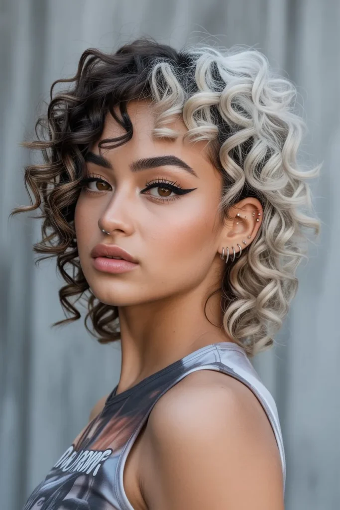 For the bold and adventurous, this dramatic two-tone curly hairstyle makes an unforgettable statement. Featuring dark chocolate brown on one side transitioning to platinum blonde curls on the other, this look is pure artistry. The stark contrast creates a stunning visual effect that’s both edgy and sophisticated, proving that curly hair can be the perfect canvas for creative color work.
