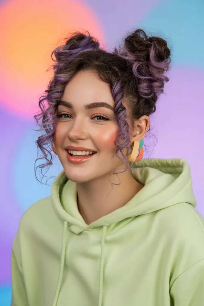The beauty of this style is in its intentional imperfection. The buns aren’t meant to be smooth or perfectly polished—instead, they’re loose and slightly messy, with curls poking out in all directions creating texture and visual interest. The face-framing curls are crucial to the overall look, softening the style and preventing it from appearing too severe or childish. The addition of colorful backgrounds or fun accessories can take this style to the next level, making it perfect for music festivals, creative events, or any occasion where you want to express your fun-loving personality.