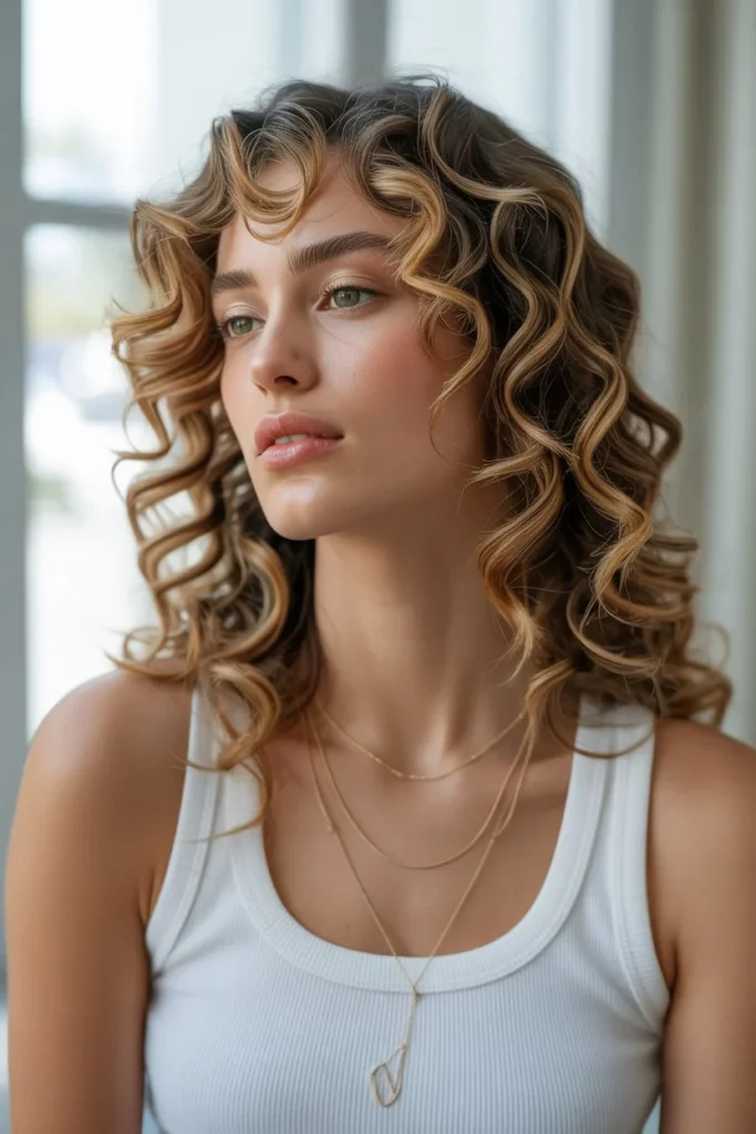 This style works beautifully on medium to long hair, with the length allowing the curls to cascade past the shoulders in gentle, flowing waves. The key to this look is in the curl pattern itself—it’s more relaxed than traditional spiral curls but more defined than simple waves. This makes it incredibly versatile and easier to achieve for those who might struggle with tighter curl patterns. The dimensional color adds incredible depth, with lighter pieces strategically placed to frame the face and catch the light.