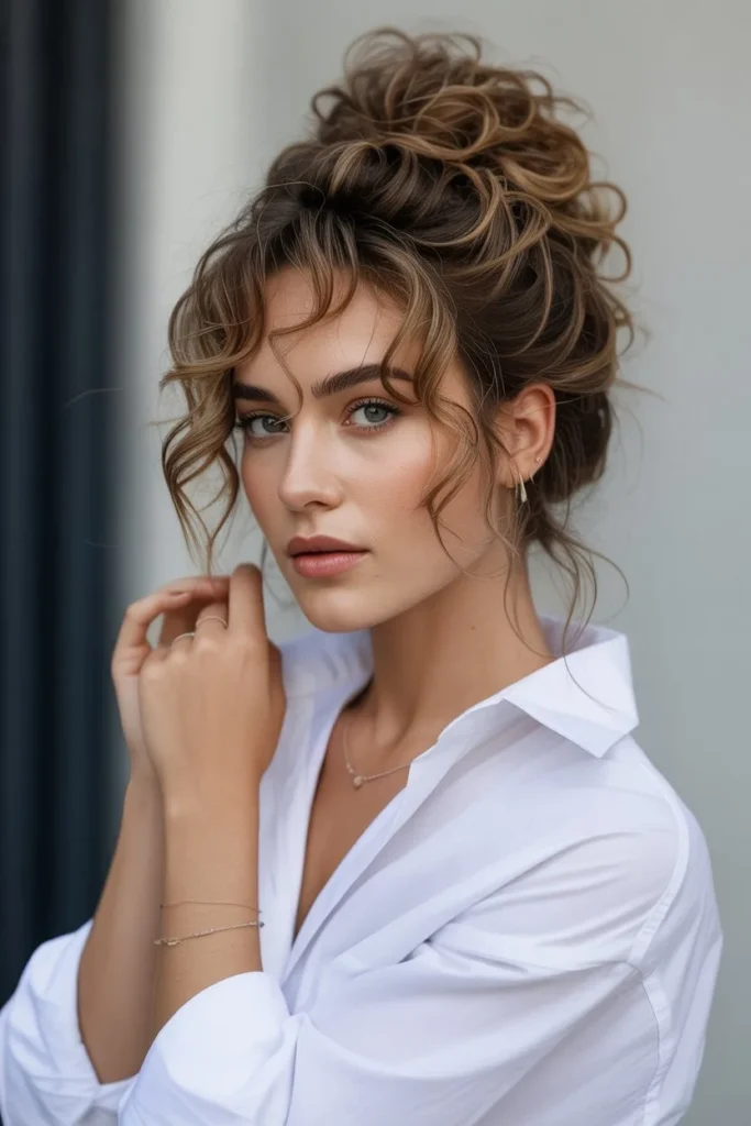 The magic of this style is in its intentional messiness. Curls are loosely gathered at the crown and secured in a way that allows plenty of pieces to escape and frame the face. These face-framing tendrils are crucial—they soften the overall look and add a romantic, dreamy quality. The volume at the crown is impressive, creating height and drama that draws the eye upward and elongates the neck. Wispy curls escape in all the right places, giving the style movement and preventing it from looking too structured or formal.