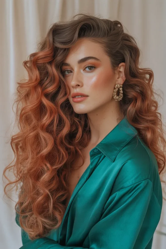 Long, luxurious curls take on a whole new dimension with the addition of rose gold tones woven throughout. This style is pure glamour, combining the romance of long, flowing curls with a trendy, fashion-forward color that’s both warm and cool simultaneously. The rose gold highlights catch the light beautifully, creating a luminous, almost ethereal effect that’s absolutely stunning.