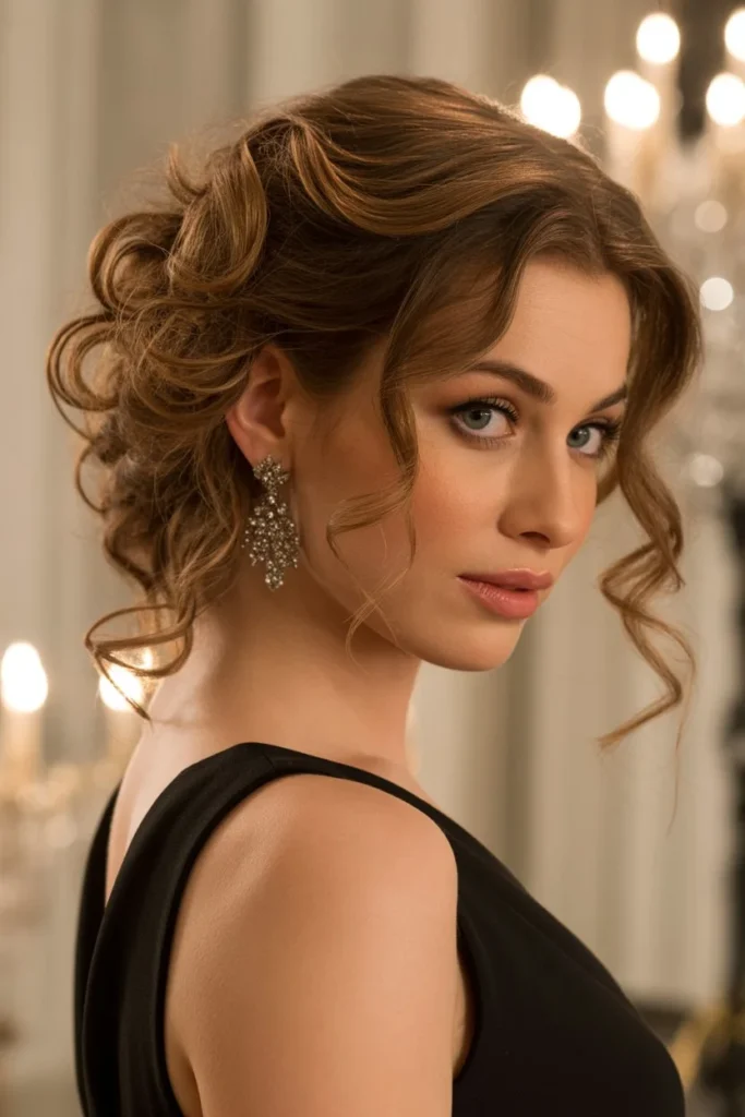 What makes this particular updo so special is how it showcases the beauty of curly hair even when it’s pulled back. Rather than smoothing the curls away, the style celebrates them, allowing each curl to maintain its shape and character while contributing to the overall elegant look. Creating this style requires starting with well-defined curls, then loosely gathering sections and pinning them in place, allowing some pieces to escape intentionally. The key is to avoid making it too perfect or structured—the slightly undone quality is what makes it so romantic and appealing. A light hairspray will keep everything in place while still allowing natural movement. This updo proves that curly hair can be just as elegant and formal as straight hair, and that sometimes the most beautiful formal styles are the ones that embrace rather than fight against natural texture.