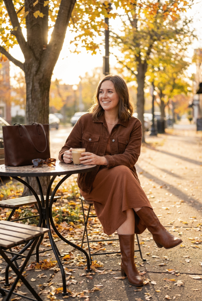 Few things capture autumn in New York better than this warm, brown-on-brown fall outfit. The cocoa bomber jacket layered over a cinnamon knit dress creates a tonal look that’s cozy and sophisticated. Mid-calf boots, a dark tote bag, and sunglasses complete the ensemble perfectly. Sitting at a small outdoor café table with a latte, surrounded by fallen leaves and bathed in golden November sunlight, this is the cozy Pinterest coffee-break vibe we all dream about.