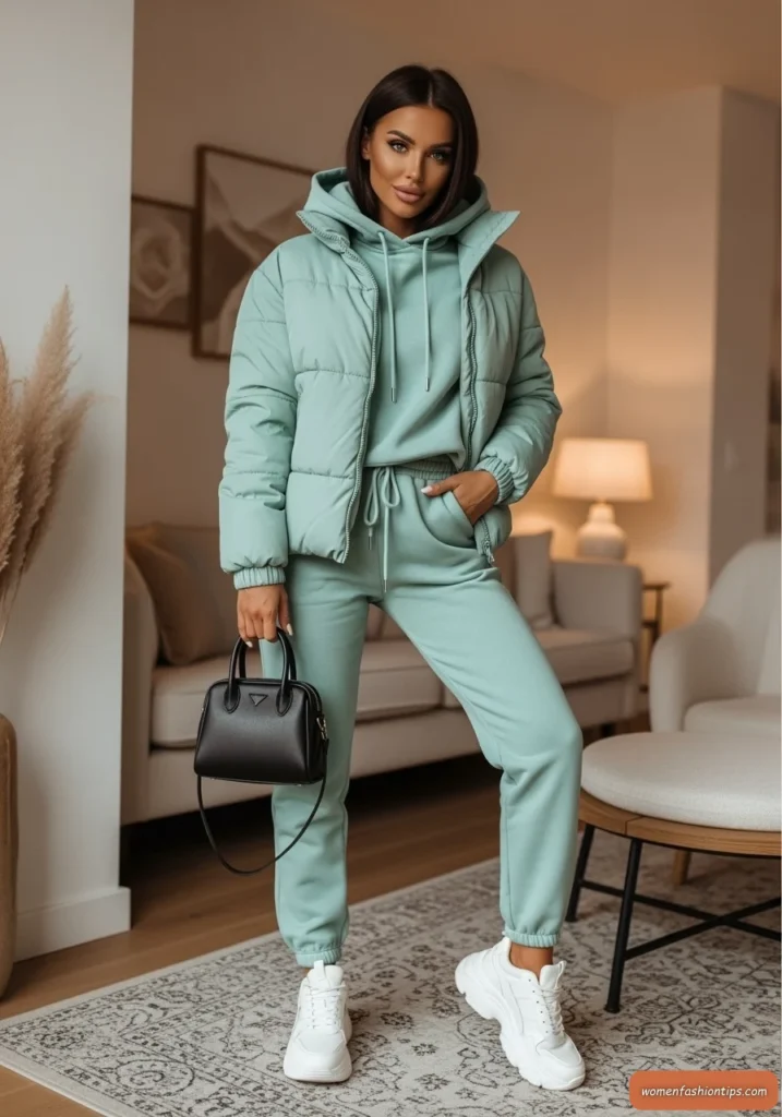 Make a statement with this monochrome mint green ensemble featuring a matching puffer jacket and tracksuit that embodies TikTok-style loungewear trends. The cohesive color story creates a bold, intentional look while the comfortable pieces ensure all-day wearability. This outfit demonstrates how loungewear can be both trendy and incredibly functional.