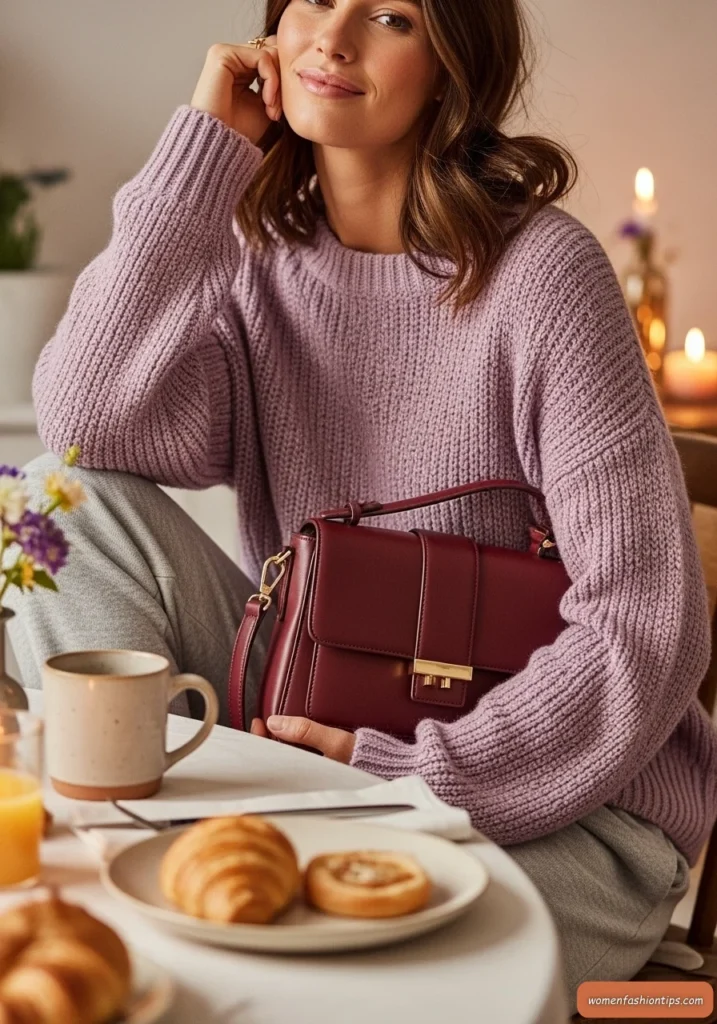 A burgundy structured bag adds a pop of deeper color and brings an element of sophistication to what might otherwise be purely loungewear. This outfit is perfect for cozy home brunches, relaxed weekend activities, or work-from-home days when you want to feel comfortable but still look intentionally put-together during video calls.