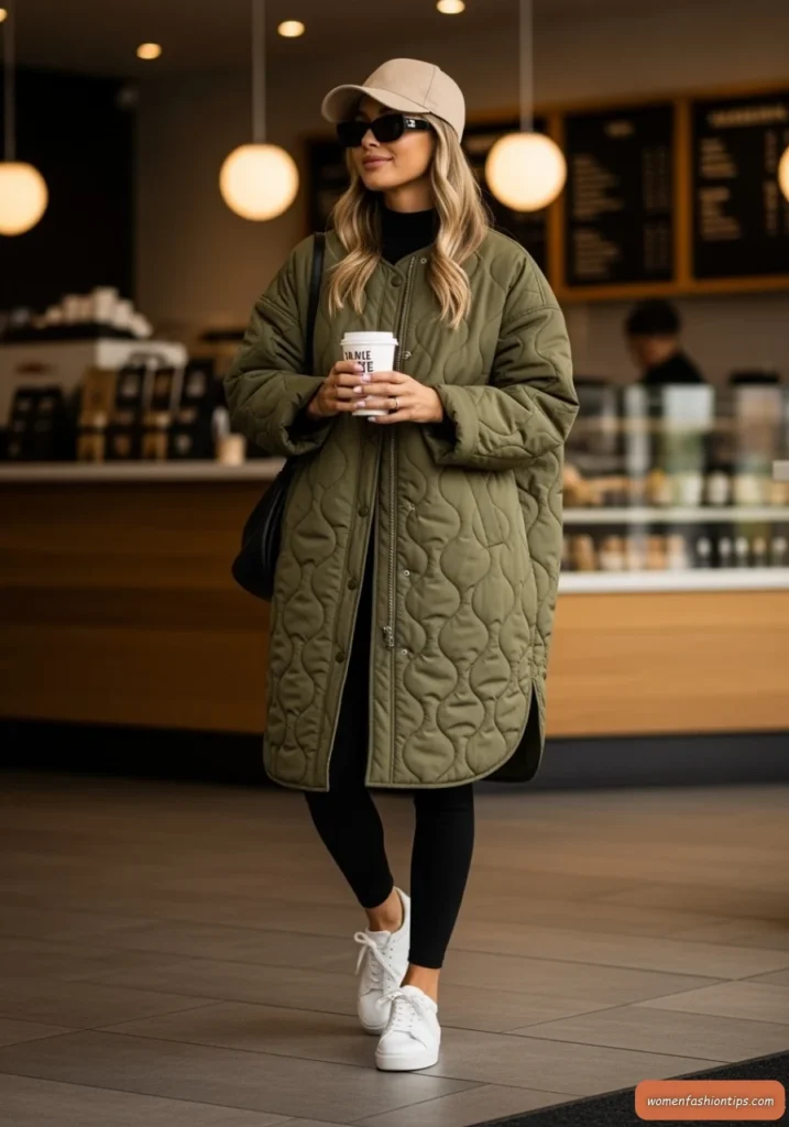 Embrace athletic-inspired comfort with this oversized olive quilted coat that brings sporty sophistication to winter layering. The quilted texture provides excellent insulation while the relaxed fit allows for easy movement and layering underneath. The olive green color is both versatile and on-trend, working well with various color palettes.