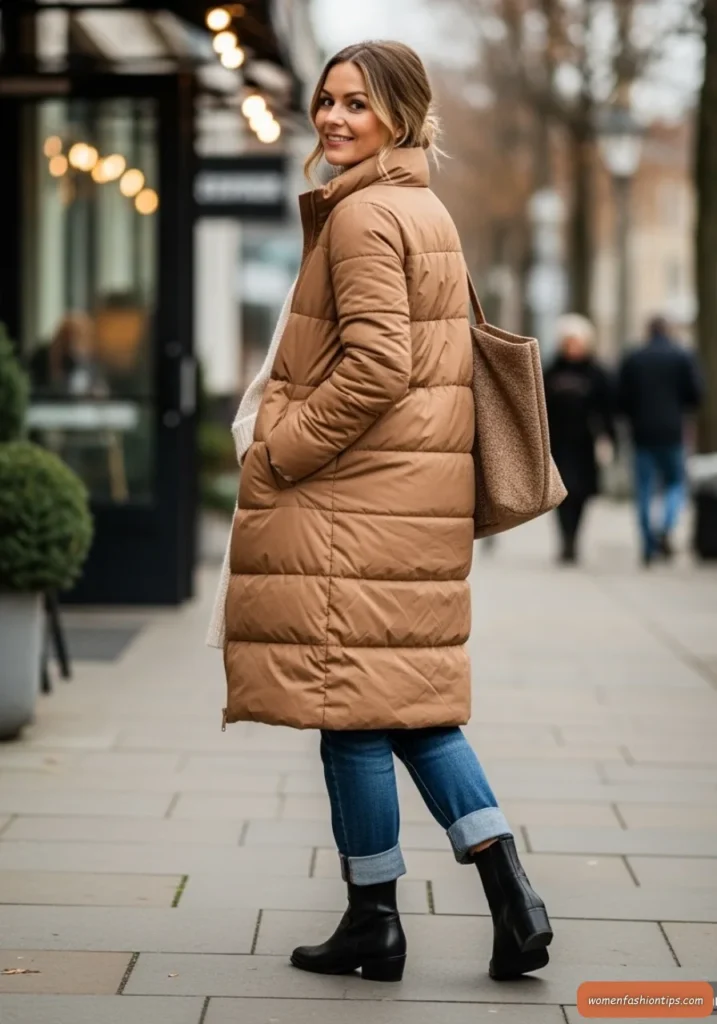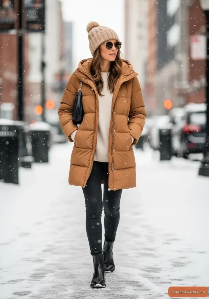 Bundle up in style with this camel puffer coat that combines practical warmth with timeless elegance. The neutral camel tone works beautifully against winter backdrops while providing versatility to pair with virtually any outfit underneath. A cream sweater creates a tonal, sophisticated base while sleek black leggings offer comfort and flexibility for winter activities.