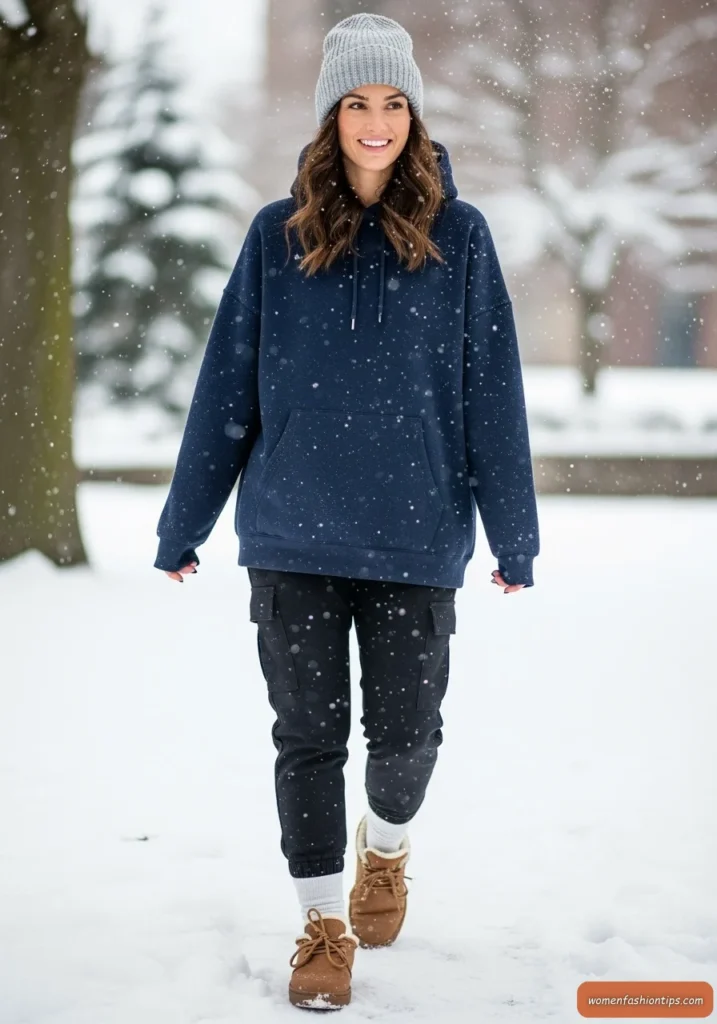 Embrace playful winter comfort with this gray beanie paired with a navy oversized hoodie that brings cozy casual vibes to snowy days. The combination creates a relaxed, approachable look that’s perfect for outdoor winter fun while maintaining warmth and comfort. The oversized hoodie provides both style and practical layering options.