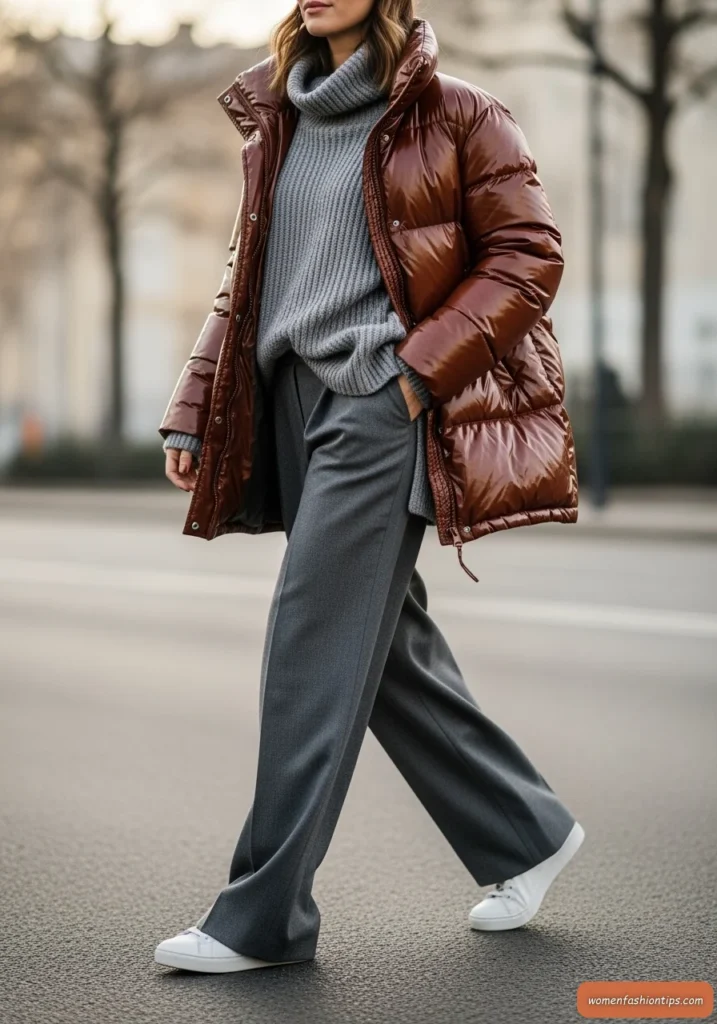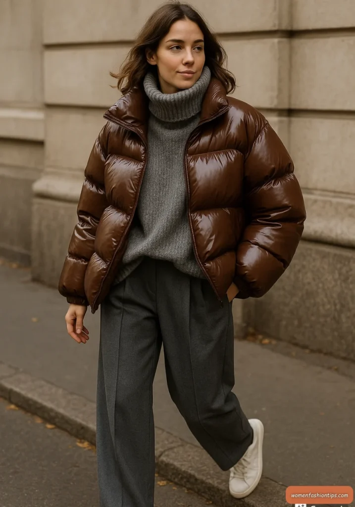 Embrace rich winter tones with this glossy brown puffer jacket that brings luxury to casual winter dressing. The rich brown color is both sophisticated and versatile, while the glossy finish adds a modern touch to the classic puffer silhouette. Wide-leg gray tailored trousers create an interesting contrast between casual outerwear and more structured bottoms.