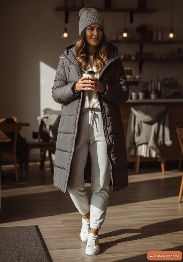 Elevate casual comfort with this charcoal longline puffer coat that brings sophisticated warmth to everyday activities. The deeper charcoal tone offers versatility while the longer length provides superior coverage and protection from winter elements. Light gray joggers create a tonal, sophisticated base that maintains comfort while looking intentional.