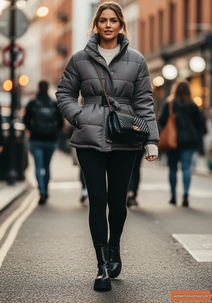 Chunky boots and a structured quilted crossbody bag complete this practical yet stylish ensemble that’s perfect for city commuting, running errands, or any day when you need to look put-together while staying warm. The beauty of this look lies in its functionality – every piece serves a purpose while contributing to an overall aesthetic that’s both comfortable and fashion-forward.