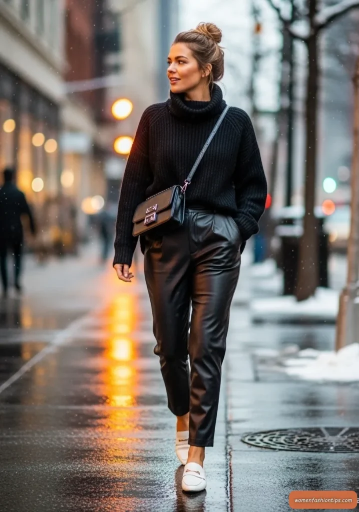 Master the art of effortless sophistication with this oversized black turtleneck paired with high-waisted faux leather pants. This combination strikes the perfect balance between comfort and edge, making it ideal for those days when you want to feel cozy but look undeniably chic. The oversized silhouette of the turtleneck provides both warmth and a relaxed fit that moves with you throughout the day.
