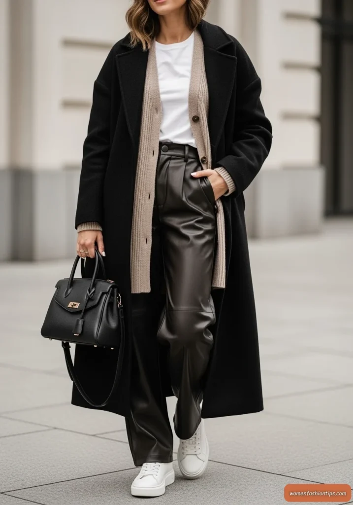 Faux leather wide-leg pants add texture and modern edge while white sneakers keep the look grounded and comfortable for all-day wear. A structured black handbag completes this ensemble that’s perfect for transitional weather, casual business settings, or any day when you want to look effortlessly sophisticated while staying incredibly comfortable.