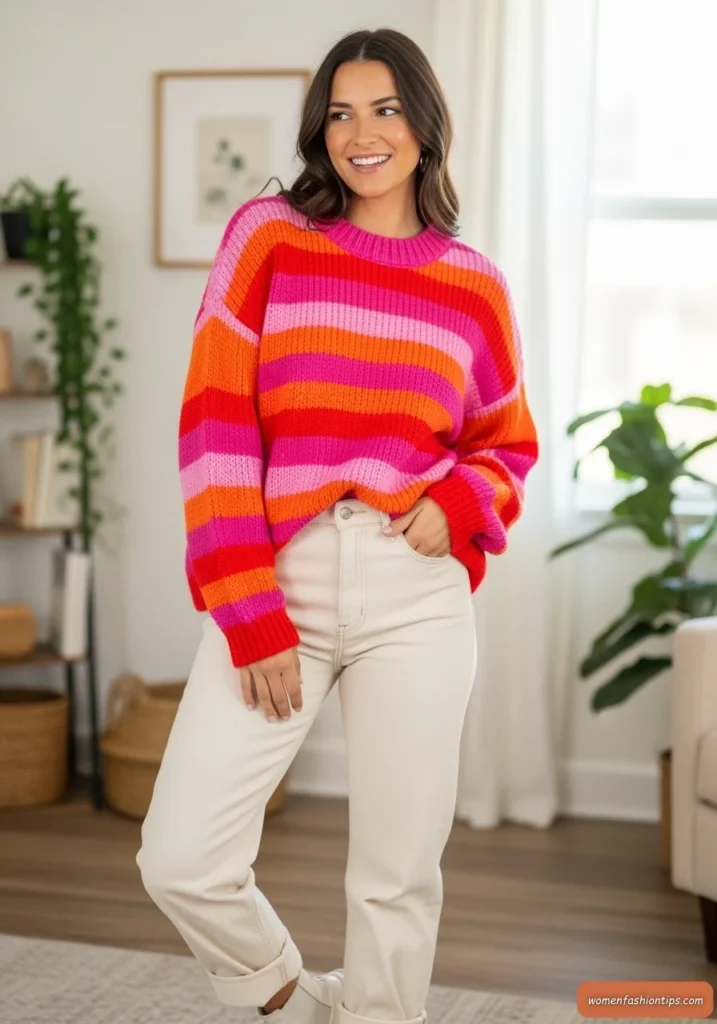Creamy straight jeans provide a neutral base that allows the sweater’s bold stripes to take center stage without overwhelming the look. This combination creates a perfect balance between playful and wearable, making it ideal for creative workspaces, casual social gatherings, or any day when you want to spread joy through fashion while staying incredibly comfortable and warm.