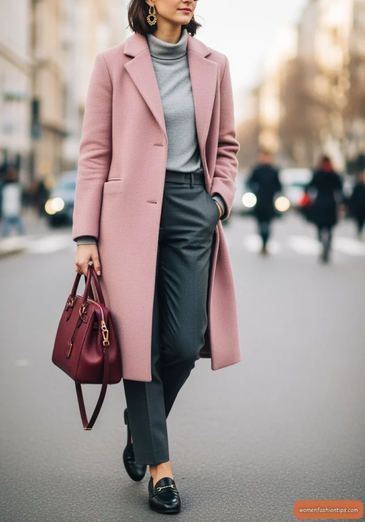 Embrace feminine elegance with this soft dusty pink wool coat that brings warmth and sophistication to winter styling. The muted pink hue offers a refreshing alternative to typical winter neutrals while maintaining versatility and wearability. Underneath, a gray turtleneck provides cozy comfort and creates a beautiful tonal contrast with the pink outerwear.
