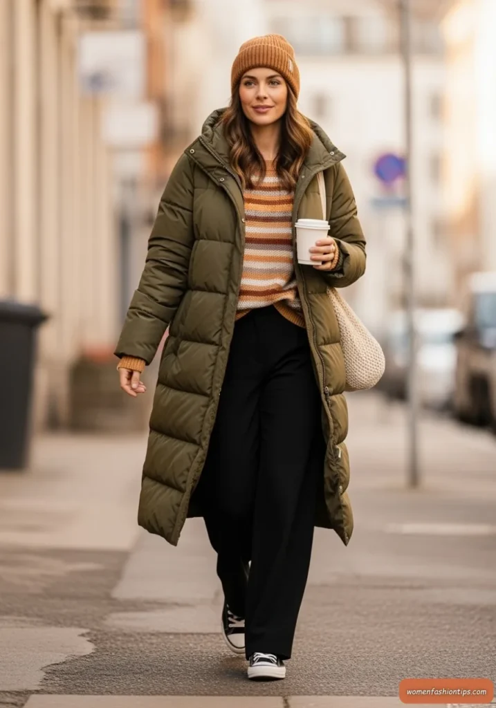 Achieve effortless style with this olive green long puffer coat that brings military-inspired sophistication to casual winter dressing. The earthy olive tone is both versatile and on-trend, while the longer length provides extra warmth and coverage. A striped knit top underneath adds pattern and visual interest while maintaining the relaxed, comfortable vibe.