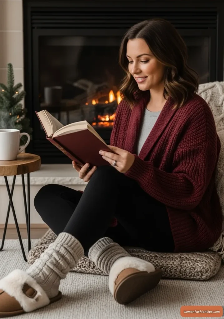 Black leggings provide comfortable flexibility while soft socks and faux fur slippers complete the ultimate comfort ensemble. This look is ideal for curling up with a book by the fireplace, cozy weekend mornings, relaxing evenings at home, or any time when comfort and coziness are the main priorities while still looking beautiful and put-together.
