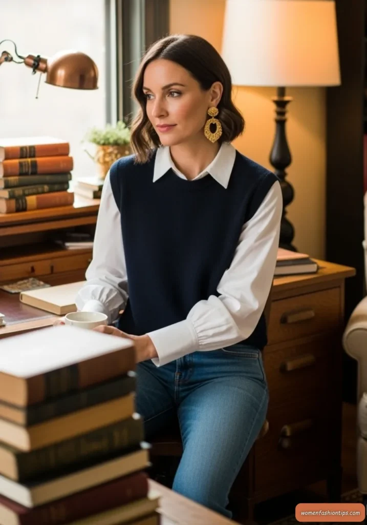 Channel intellectual sophistication with this modern preppy ensemble featuring a crisp white blouse layered under a navy sweater vest. This combination brings a fresh take on classic preppy styling while ensuring warmth and comfort during colder months. The layered approach allows for temperature regulation while creating visual depth and interest.