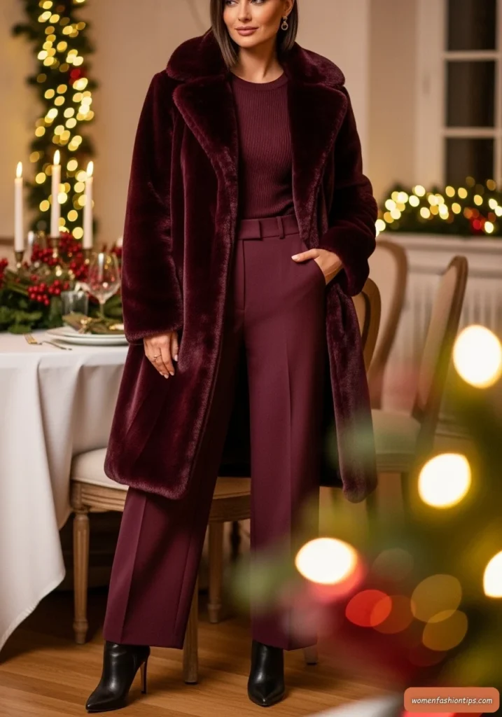The beauty of this ensemble lies in its ability to make you feel both glamorous and comfortable simultaneously. Luxe heeled boots or sophisticated loafers complete the look while maintaining walkability and warmth. This outfit is ideal for elegant holiday dinners, special occasions, or any time you want to add a touch of luxury to your winter wardrobe while staying incredibly cozy.