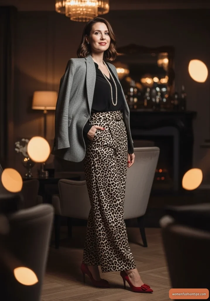 Create evening elegance with this sophisticated gray blazer paired with leopard print wide-leg trousers that bring personality and movement to winter styling. The neutral gray blazer provides a polished foundation while the leopard print adds visual interest and confidence. This combination demonstrates how comfort and glamour can coexist beautifully.