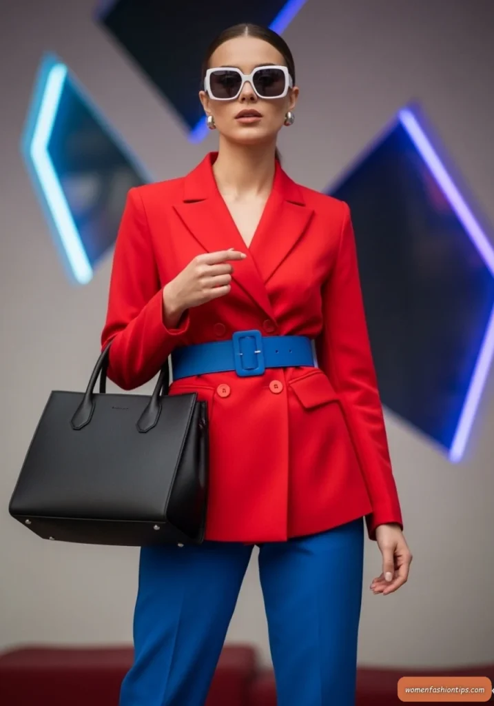 Step into the future of power dressing with this striking red double-breasted blazer that commands attention while maintaining comfort. The bold red color makes an unapologetic statement, while the structured silhouette provides both warmth and authority. A cobalt blue belt creates an unexpected color combination that feels fresh and modern.