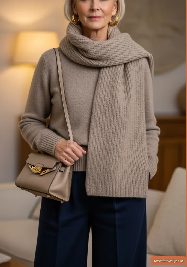 The epitome of quiet luxury, this ensemble showcases the beauty of neutral tones and sumptuous textures. The layered taupe cashmere pieces create depth and richness while remaining supremely comfortable and elegant. The chunky scarf adds both warmth and texture, while the wide-leg navy pants provide a sophisticated contrast that grounds the soft, neutral palette.