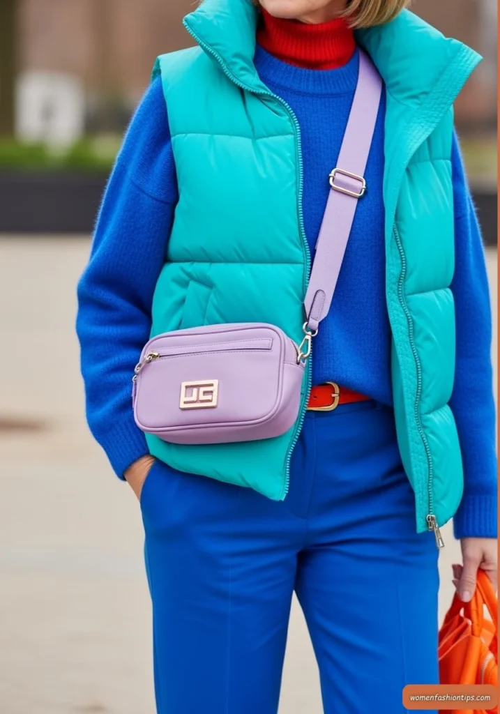 Color blocking reaches new heights of sophistication in this vibrant ensemble that proves mature women can absolutely embrace bold, joyful colors. The bright turquoise puffer vest creates a striking focal point when layered over the coordinating cobalt blue sweater and trousers set. This monochromatic blue foundation is then energized with unexpected pops of lilac and orange in the accessories, creating a look that’s both harmonious and dynamic.