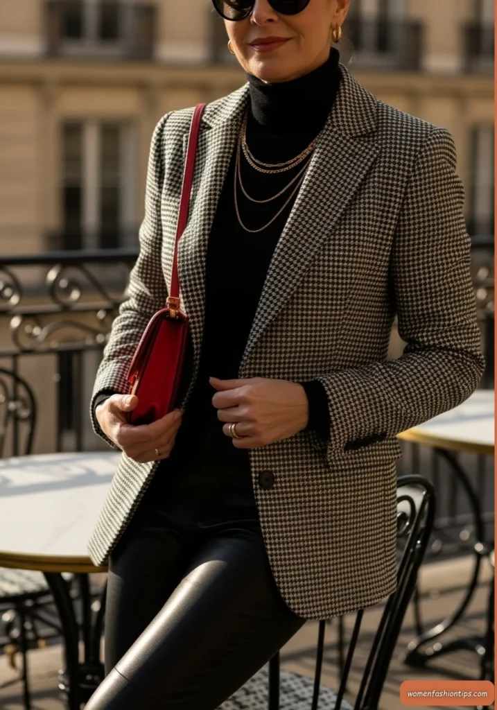 Classic houndstooth gets a contemporary update when styled with sleek leather pants and strategic pops of color. This blazer represents timeless sophistication with its traditional pattern, but the modern styling keeps it feeling fresh and current. The black turtleneck underneath provides a sleek foundation that allows the blazer’s pattern to take center stage, while the leather pants add an edgy element that prevents the look from feeling too conservative.