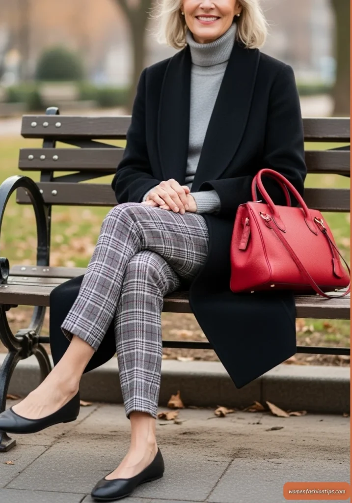This look demonstrates the power of strategic color blocking – a technique that becomes increasingly flattering as we age. The structured coat provides excellent coverage while creating a polished silhouette, and the small structured handbag adds just the right amount of sophistication. This outfit is perfect for those days when you want to make a statement without saying a word, whether you’re running errands around town or meeting friends for lunch. The combination of textures and colors creates visual interest while remaining thoroughly wearable and age-appropriate.